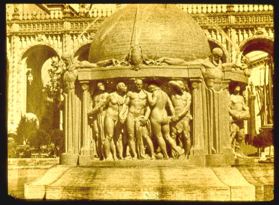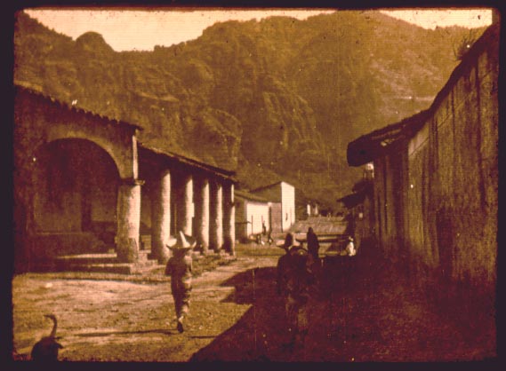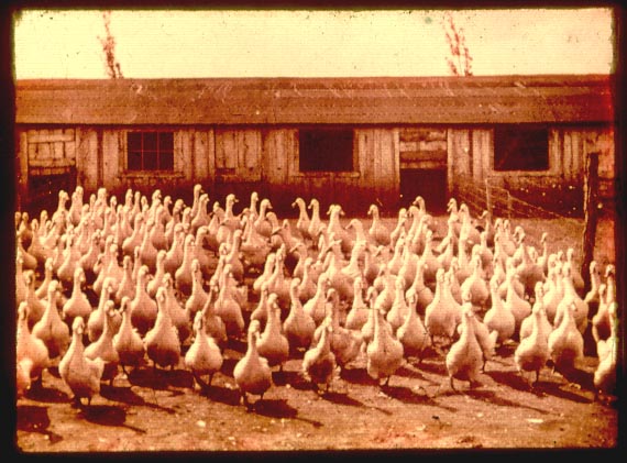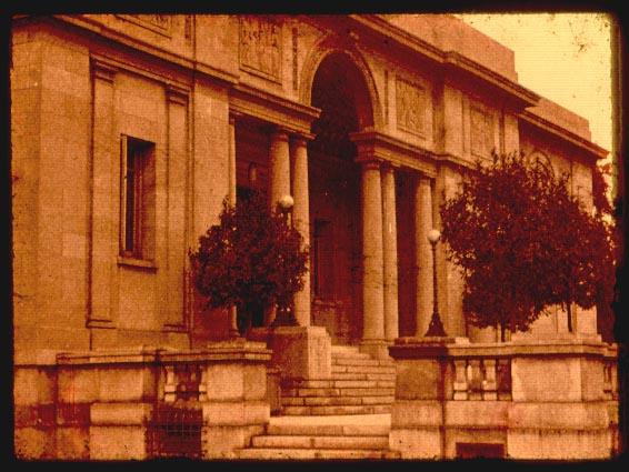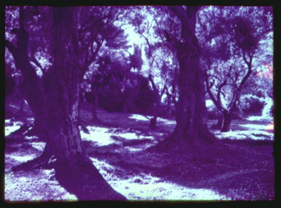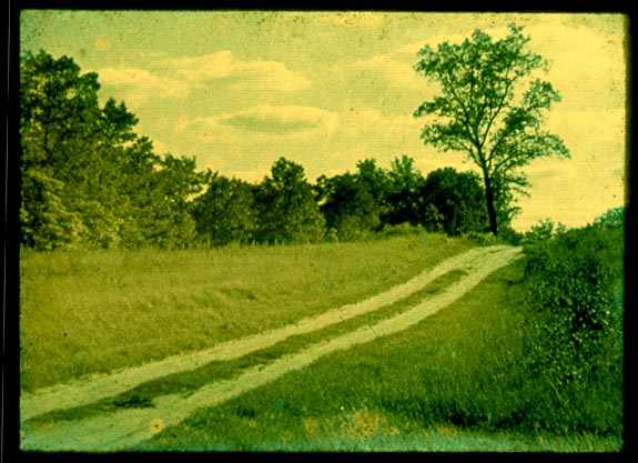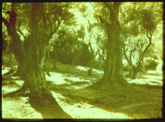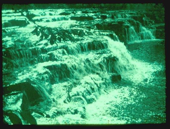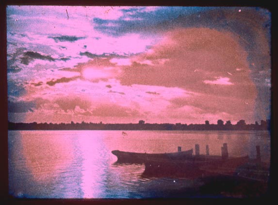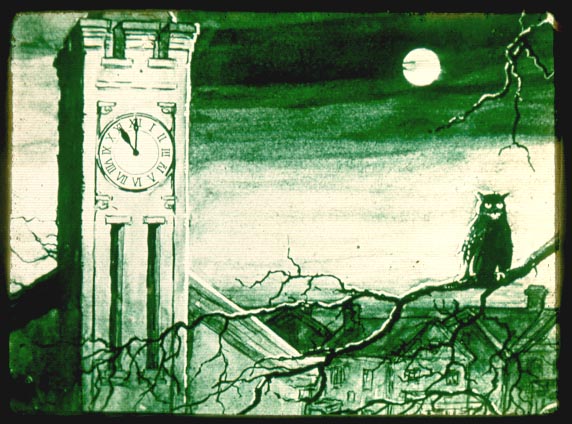 The method of compounding this bath is very important. Each of the solid chemicals should be dissolve separately in a small quantity of warm water, the solutions allowed to cool, filtered into the tank strictly in the order given, and the whole diluted to the required volume. If these instructions are followed, the bath will be a pale yellow color, and perfectly clear. Time of Toning-Two to ten minutes at 70ºF. (21º C.). The color of the toned image varies from light bluish-gray for short time toning (about 3 minutes0 to a deep blue for a long time toning (10 minutes0. (See Sample no. 25.) Time of Washing Wash for ten to fifteen minutes until the highlights are clear. A very slight permanent yellow coloration of the dear gelatin will usually occur, but should be only just perceptible, when it will have no effect on projection. If the highlights are stained blue, then either the film was fogged during development or the bath was not compounded correctly: Washing should not be carried out for too long a period, especially with water inclined to be alkaline, because the toned image is soluble in alkali. Life of Bath. If the acid is renewed to the extent of the original amount after toning each 5000 feet, the bath is capable of toning 15,000 feet per 50 gallons of solution. If even after revival, the tone remains flat, the bath, is exhausted and should be thrown away. Alter continued use, a slight bluish sludge will collect in the bath, but this is not harmful. Should this form, to any appreciable extent, it is due either to incorrect mixing, the action of light, or contact with metallic surfaces, or the presence of hypo in the bath. Mixed Uranium and Iron Tone This particular tone is obtained by first toning in the Uranium bath for about 3 minutes and then in the Iron bath for about 2 minutes. Any longer immersion in the Iron bath makes the tone colder and vice versa. (See Sample N0. 26).