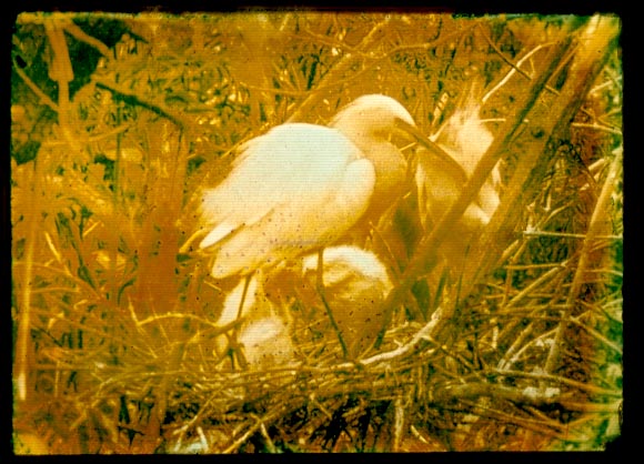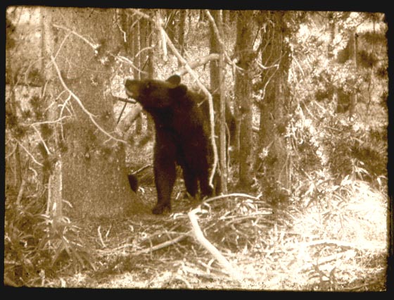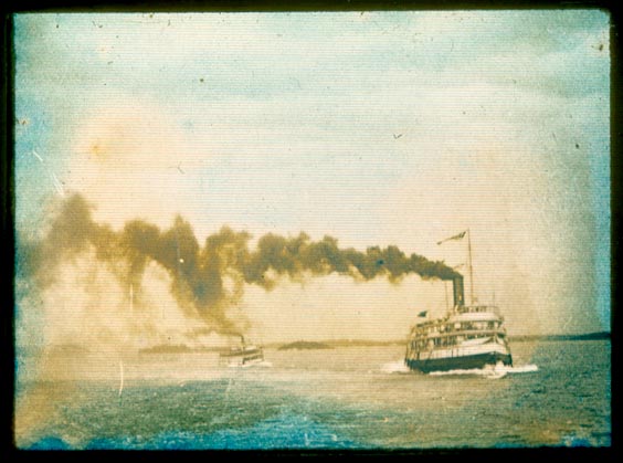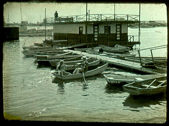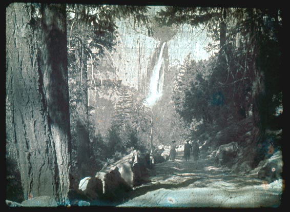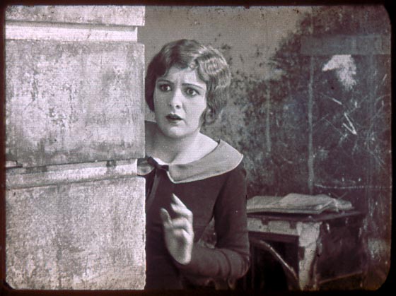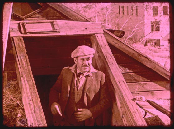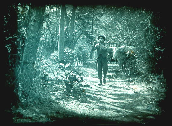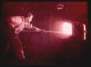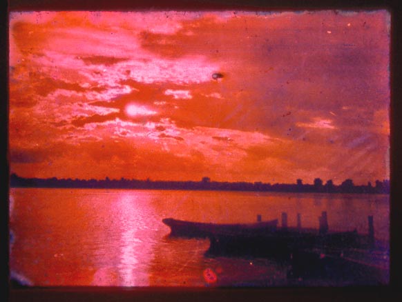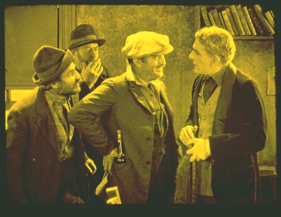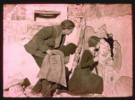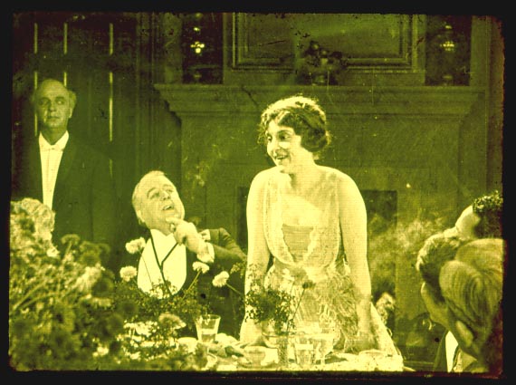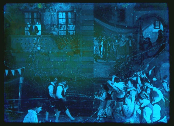 Method of Preparing the Dye Solutions Dyes should be mixed in glazed earthenware or enameled iron pails or crocks using warm water when necessary. A separate wooden paddle should be used for mixing each dye and washed thoroughly after using. Dissolve the solid dyes in as small a volume of hot water as possible, and filter through fine muslin. Pour hot water over any residue remaining so that all the dye will be dissolved, and dilute the solution in the tank to the required volume at 65° F. (18° C.). Depth of Tint The depth of the tint depends on the following factors: 1. Nature and Strength of the Dye Bath Except in special cases such as fire scenes, sunset and moonlight effects, it is very undesirable to employ strong tints since apart from the displeasing effect and irritation to the eye, the dyes produce a slight softening of the gelatin film when used at 80 F.(27ºC.) in a 1% solution. When delicate tints are employed, the effect is both to remove the contrasty black and white effect, and to add a touch of warmth to the black deposit of silver, even in cases where the highlights are insufficiently stained to be notice able. The result in many cases is equal to that obtained by partial toning. 2. Temperature of the Dye Bath Although temperature has little effect on the rate of dyeing with the dyes recommended, when used without the addition of acid, it is advisable in all cases to work at 65° to 70° F. (18º -21º C.) to produce uniform results and remove any danger of softening the film. 3. Time of Dyeing In order to duplicate any particular tint with given dye bath the film may be dyed either by time or by inspection. Dyeing by time is reliable if the dye bath does not contain acid, though if acid is present, in time the acidity decreases, slowing down the rate of dyeing, so that it be comes necessary to judge the progress of dyeing by inspection. If two or more tints of the same color are required, it as better to vary the time of dyeing rather than to vary the dilution of the bath, as a means of reducing the number of individual dye baths to a minimum, providing the time of dyeing for the lighter tint is not less than one minute. This time is considered a minimum for the production of uniform results and for complete control of the dyeing operations. The time of dyeing also depends somewhat on the previous handling of the film. Film fixed in a bath containing potassium or chrome alum, dyes more quickly than that treated with plain hypo and hardened with formalin. Should the film for any reason be over-dyed, some of the dye may be removed by washing for 10 to 15 minutes, though the fastness of the dyes to bleeding will permit only slight mistakes to be rectified in this manner. Life of the Dye Bath This averages about 40,000 feet of film per 50 gallons of dye bath. As the rate of dyeing slows down the bath should be revived by adding a concentrated solution of the dye and not by adding acid. When the bath becomes muddy, especially in warm weather it should be renewed. Method of Procedure Either the "drum" or "rack" method may be employed, the rack being agitated slightly to insure even dyeing and prevent accumulation of air bubbles, after which the film should be given a thorough rinsing in plain water. When tinting on processing machines, the strength of the dye bath should be adjusted according to the speed of the machine. Before drying films on racks it is advisable to set the rack at a slight angle for a few minutes, to enable the surplus water to drain off more readily through the perforations. If drums are used for drying it is advisable to remove the surplus water by whirling the drum previous to drying. If uniform results are to be obtained, film should never be passed through the projector before tinting or toning. How to Obtain Intermediate Tints Sample tints may be readily obtained by making a trial with a small quantity of solution on a short length of film, taking care to match the tint in artificial light and not by daylight. When matching colors, the tint should be considered as being made up of one or more of the colors, red, yellow, and blue. Colors such as orange are made by mixing yellow and red, violet by mixing red and blue, and green by mixing yellow and blue. Browns are obtained by mixing all three colors, red, yellow, and blue. In case only a few tanks are available for tinting it is possible to obtain intermediate tints by placing the film in successive dye baths. For example, if an orange tint is desired first immerse the film in the red dye bath and then in the yellow bath. It is not possible, however, to reproduce tints by this method with precision. An alternative method is to choose a tinted base whose color most nearly approaches the desired color and modify this by immersion in a suitable dye bath. Local and Multiple Tinting Very pleasing effects may be secured by locally tinting a portion of the film picture; This can be done either by coloring each picture separately by hand or by cutting a stencil and applying the dye through the stencil by application rollers or by spraying, or a resist such as a transparent varnish may be applied either by hand or by stencil to those portions which are not to receive dye and the film immersed in the dye solution in the usual way. Multiple tinting is executed in the same way. Light Transmission The amount of light cut off from the screen as a result of tinting depends upon the nature of the particular dye, the concentration of dye in the film, and on the purity of color of the dye. An interesting series of measurements recently made in the Research Laboratory of the Eastman Kodak Company show that the screen brightness is diminished by from 25% to 95% as a result of tinting. Excepting in special cases, therefore, it is very desirable to keep the tints as light as possible, or at least no deeper than is required to produce the necessary color sensation. Streaks and Uneven Coloring. These may be caused by: (a) 