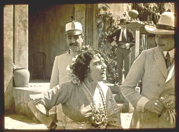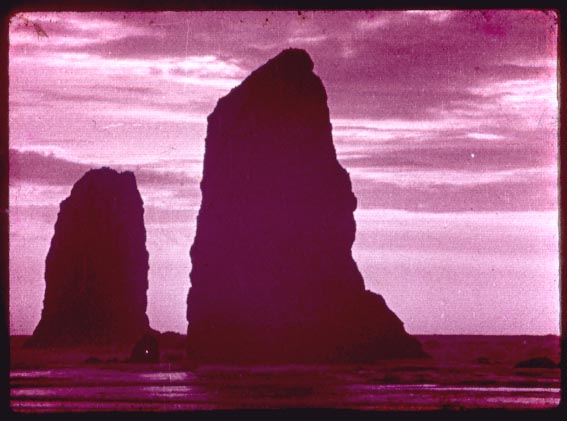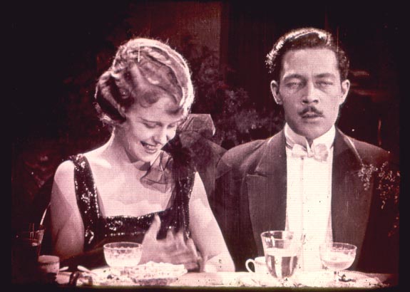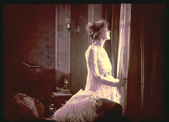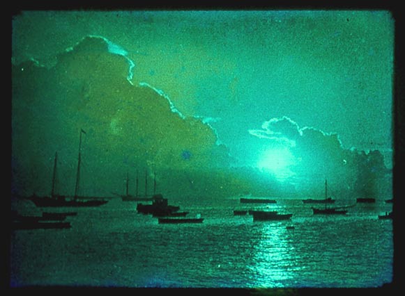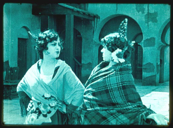 Tinting and Toning of Eastman Positive Motion Picture Film In the production of motion picture film it is common to vary the color of the film either by toning or tinting or by a combination of the two processes. Tinting, as usually understood, consists in immersing the film in a solution of dye which colors the gelatin, causing the whole picture to have a uniform veil of color on the screen, though there are other ways of producing the same effect as follows: 1. By the use of color screens at some point in the path of the beam of light in the projector. The color screens may consist of sheets of colored glass or of dyed gelatin similar to the usual photographic filters, conveniently mounted in a circular rotating holder placed in front of the projector lens. This method is very satisfactory if a long run of film is to receive the same tint though if the tint has to be changed between scenes some mechanically operated arrangement is necessary. Interesting effects may be secured by using a compound filter composed of two or more sections placed at a suitable distance in front of the lens so that one color will diffuse into the other on the screen. 2. By coloring the film base. This is the ideal method of securing the necessary tinted effect and Eastman Positive Film with tinted base is now available in a number of colors on both nitrate and acetate stock. Toning consists in either wholly or partially replacing the silver image of the positive film by some colored compound, so that the clear portions or highlights of the image, which consist of plain gelatin remain unaffected and colorless. Toning effects may also be secured by floodlighting the screen from the sides by using suitable color filters in conjunction with the floodlights.