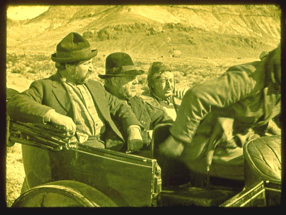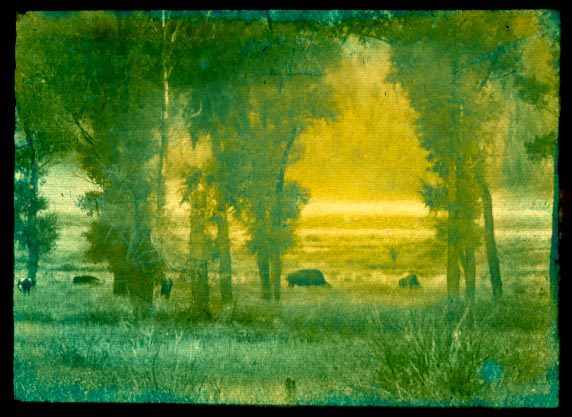 How to Modify a Dye Toned Image In case a length of film is over-dyed, some of the dye may be removed by immersing in an 0.2% solution of concentrated ammonia and rinsing before drying. If after dyeing for 10 minutes the image does not mordant sufficient dye, thoroughly wash, immerse again, in the mordanting bath, wash and then place in the dye bath. Intermediate Dye Tones Intermediate colors may be obtained either by mixing the dye solutions as in tinting or by immersing the film in successive dye baths. For instance, if a yellowish green tone is desired, first tone in the yellow bath and then immerse for a short time in the green bath. See Samples Nos. 42 and 46. Sample No. 42 was obtained by dyeing first in Chrysiodine and then in Safranine and Sample No. 46 by first dyeing in Auramine and then in Victoria Green. Double Tones It has been found that by omitting the ammonium alum from the Iron toning formula the hall-tones of the toned film are white and the shadows blue, and if this image is then immersed in any of the basic dye solutions as used for dye toning, the dye is mordanted to the half-tones, while the shadows remain more or less blue. By varying the dye solution used, the color of the half-tones may be varied at will. See Samples Nos. 52, 53, and 54. In order to secure double-tones, proceed as follows: